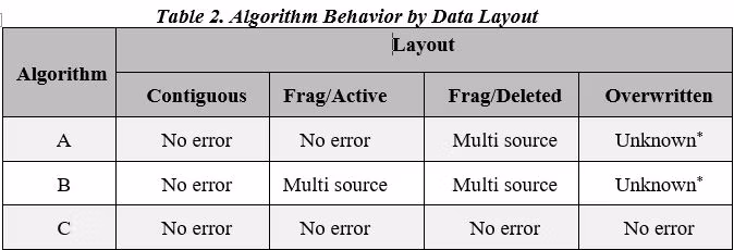 An error rate for each algorithm can be defined, but calculating the error rate is not really practical. For algorithm A, none of the files recovered from layouts 1 or 2 have the multiple source error and all files from layout 3 have the multiple source error. (Ignoring layout 4), an error rate for a particular drive can be calculated by counting the number of occurrences of each layout. An estimate of the error rate could be estimated if a large corpus of drives were examined where the layouts were accurately known. However, there is not a practical way to know what the actual layouts are. The same considerations apply to algorithm B. As for algorithm C, the multiple source error never occurs.