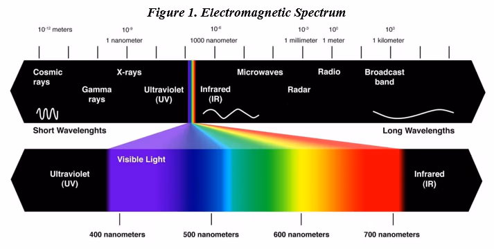 The visible portion of the electromagnetic spectrum (Figure 1) includes wavelengths of approximately 400-700 nm. IR is outside the visible spectrum of light. In general, the NIR range from 700 to 900 nanometers has the most practical application for forensic photography.