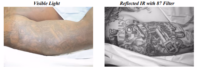 This technique is beneficial when an item of evidence and its background are the same tone under visible light but react differently to IR. Documentation of evidence such as blood or gunshot residue on dark clothing, injuries or tattooing on skin, and questioned documents may benefit from the use of IR photography.