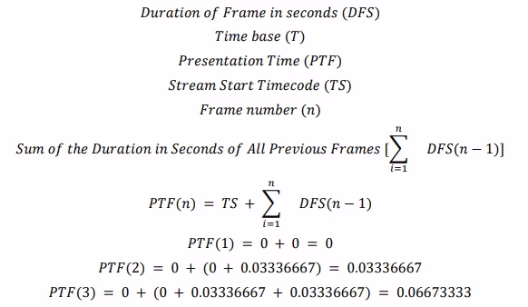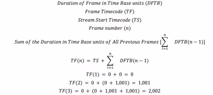 For example, a video stream might have a time base of 30,000. In this stream, frame 1 has an encoded frame duration of 1,001, frame 2 has an encoded frame duration of 1,001, and frame 3 has an encoded frame duration of 1,001. We can determine the timecode for each frame with the following calculations, assuming in this case that the timecode starts at 0:
