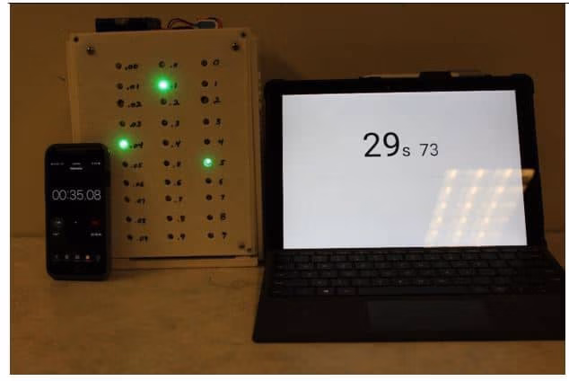 The image above shows an LED light timer as compared to a cell phone and an internet-based stopwatch. Multiple still images are captured and the time differences for each device in those images is calculated. The time differences between each frame should be consistent, as shown below: